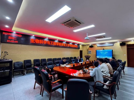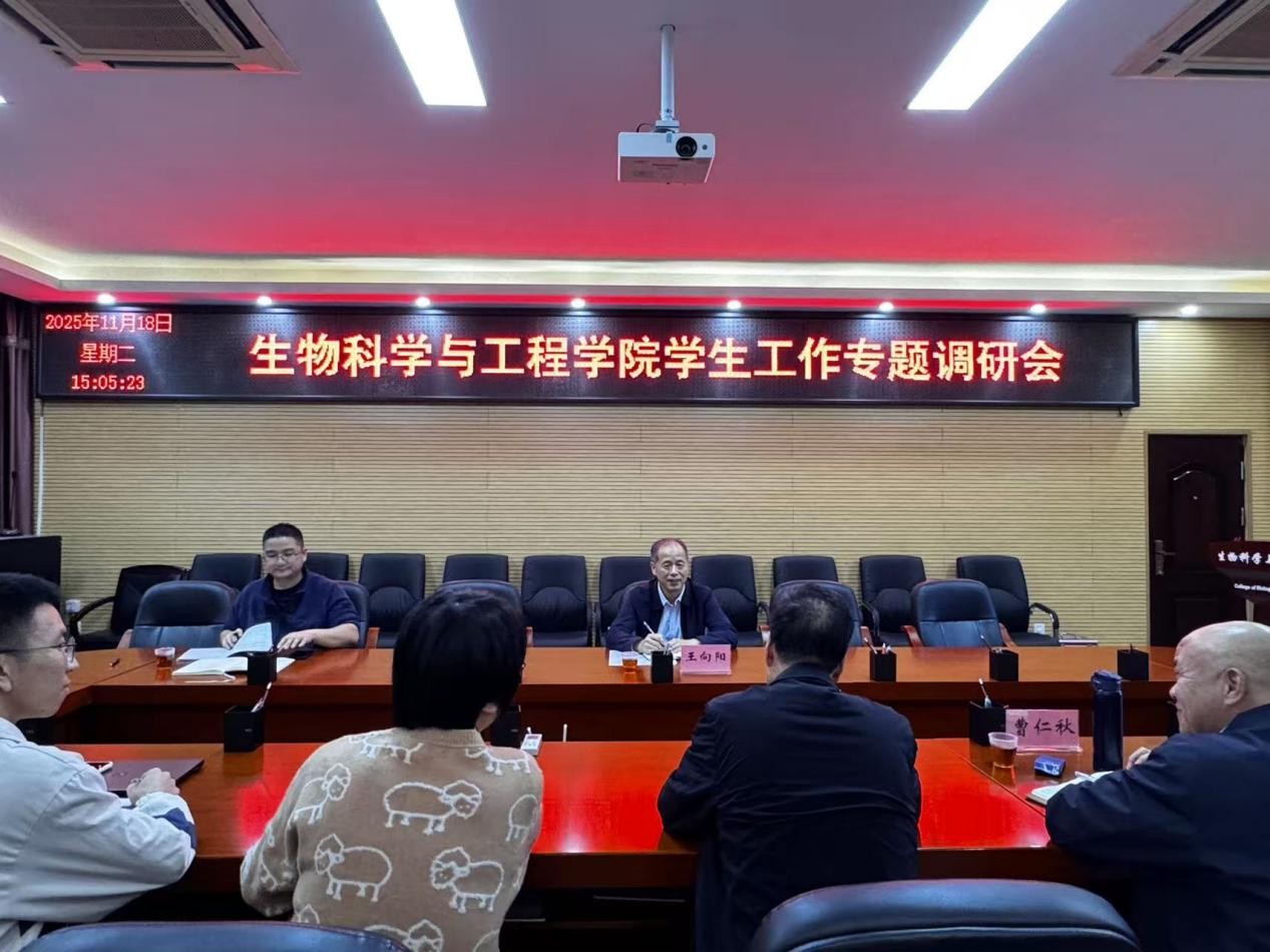 2025年11月18日下午,校党委副书记王向阳莅临生物科学与工程学院,就学院学生工作开展专题调研与指导。院党委书记李礼建、副书记曹仁秋及全体学生政工干部参加了本次调研座谈会。
