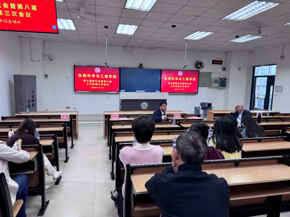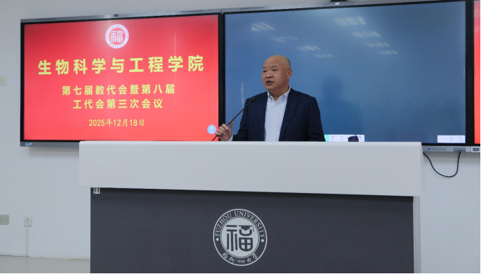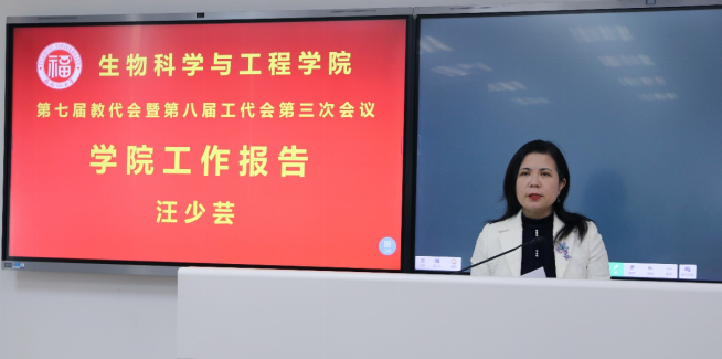 2025年12月18日下午,福州大学生物科学与工程学院第七届教代会暨第八届工代会第三次会议在旗山西3-204隆重召开。全院教职工齐聚一堂,全面总结回顾了学院2025年度的各项工作成就,科学谋划了2026年的发展蓝图。院党委李礼建书记、院长汪少芸教授、副院长石贤爱教授、院党委曹仁秋副书记、副院长王航副教授出席会议。
