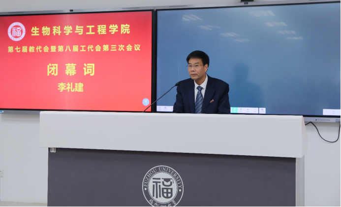 学院党委书记李礼建同志致闭幕词。他对大会的顺利召开和取得的成果表示祝贺,对全体代表的辛勤付出表示感谢,并号召全院教职工在新的一年里,继续凝心聚力,锐意进取,将会议确定的各项目标任务落到实处,共同谱写生物科学与工程学院高质量发展的新篇章。